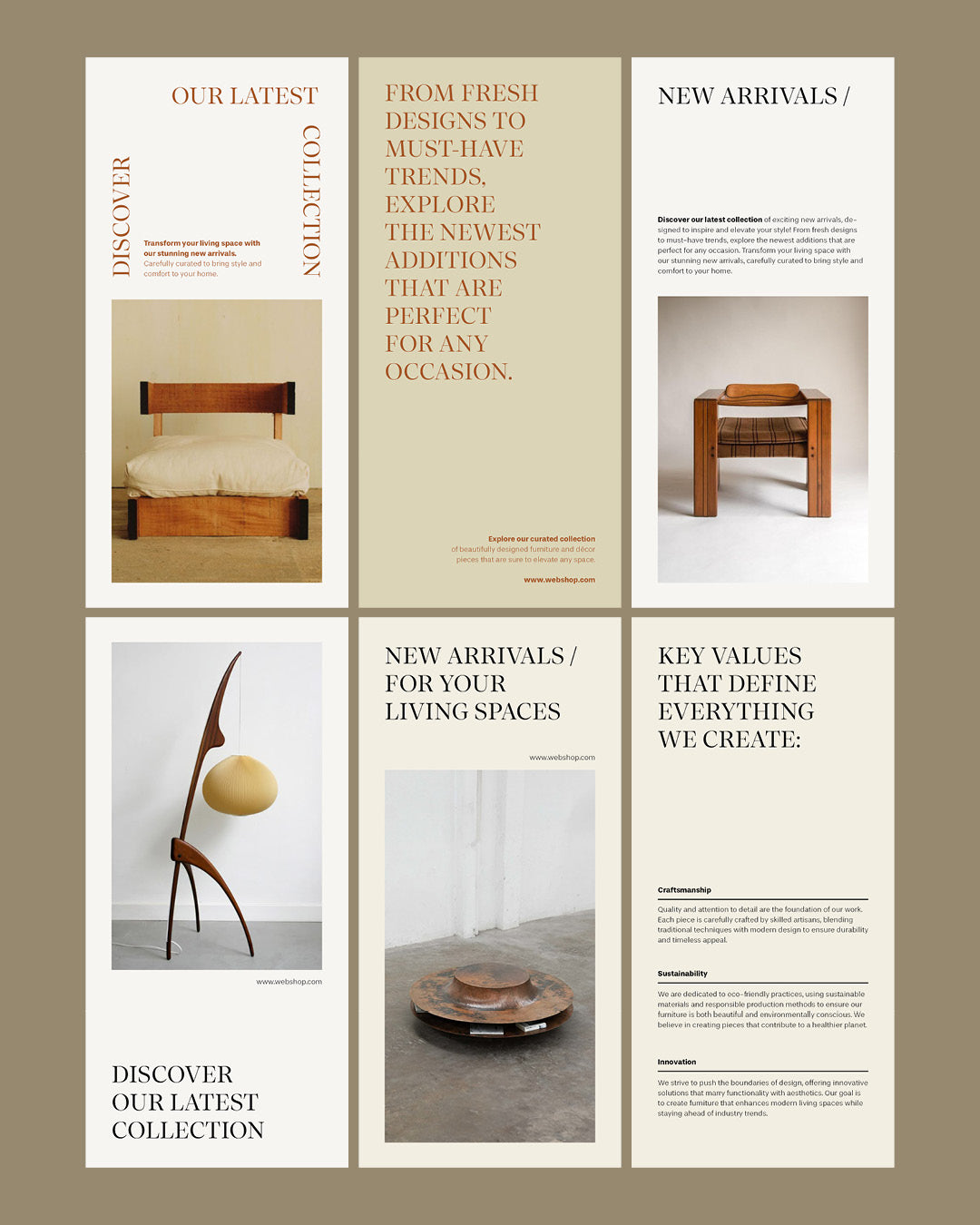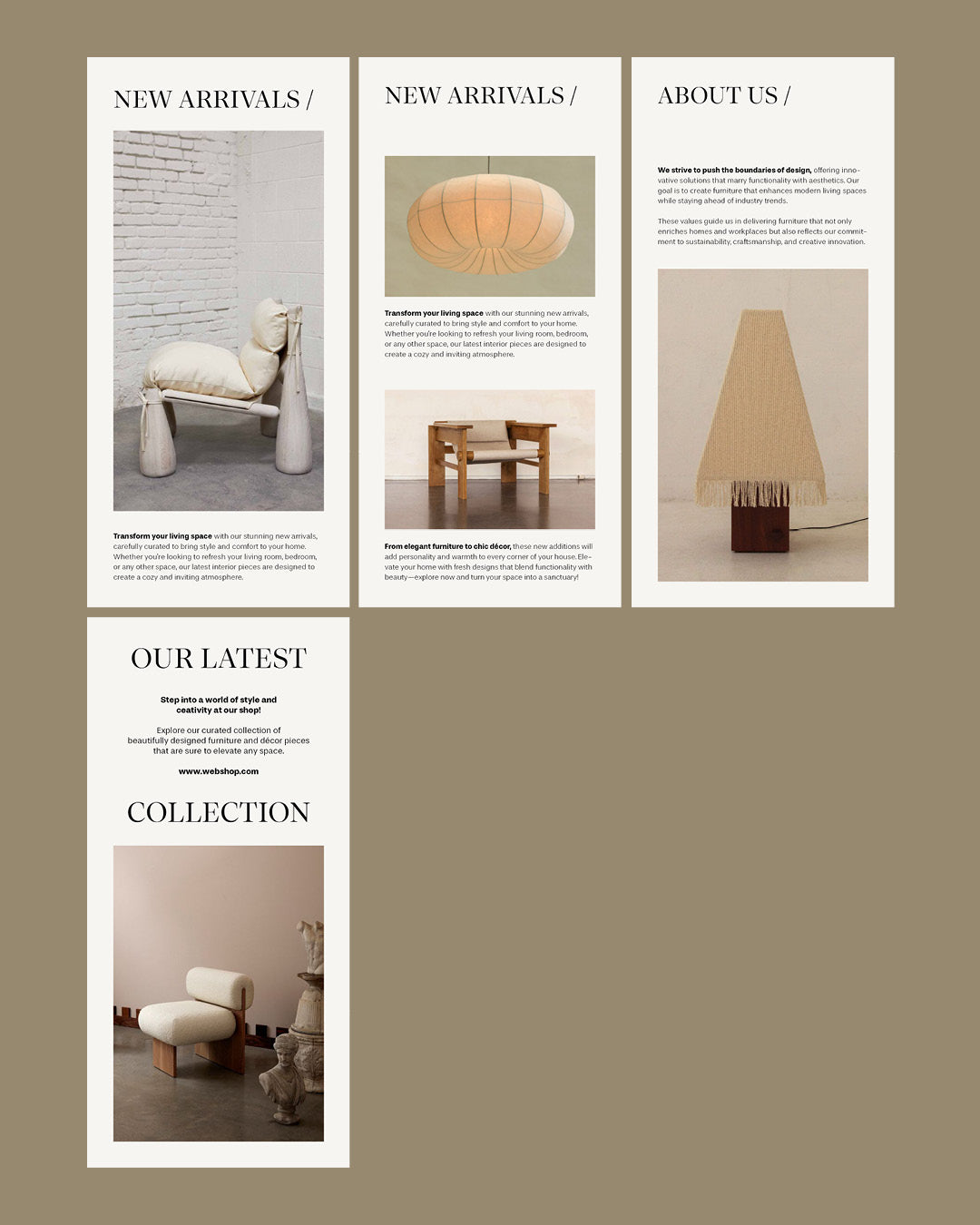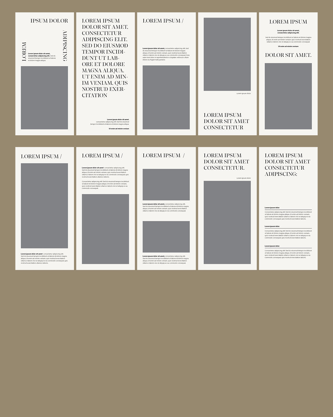 These layouts explore creative typography and headline direction, offering a dynamic balance between playfulness and refinement. With a focus on aesthetic composition, the pages invite movement and variation while maintaining a minimal and sophisticated feel.