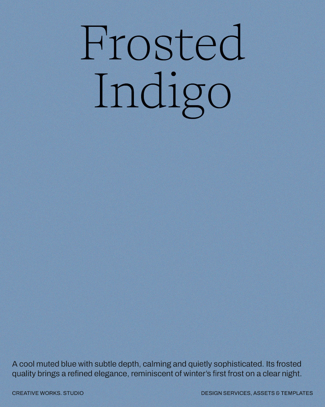 A cool muted blue with subtle depth, calming and quietly sophisticated. Its frosted quality brings a refined elegance, reminiscent of winter’s first frost on a clear night.