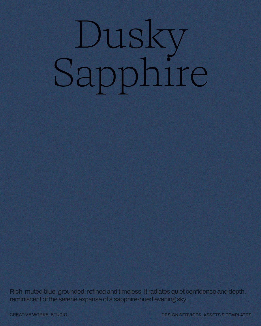 Rich, muted blue with velvety undertones, grounded, refined and timeless. It exudes quiet confidence and a sense of depth, like the serene expanse of a sapphire-hued evening sky.