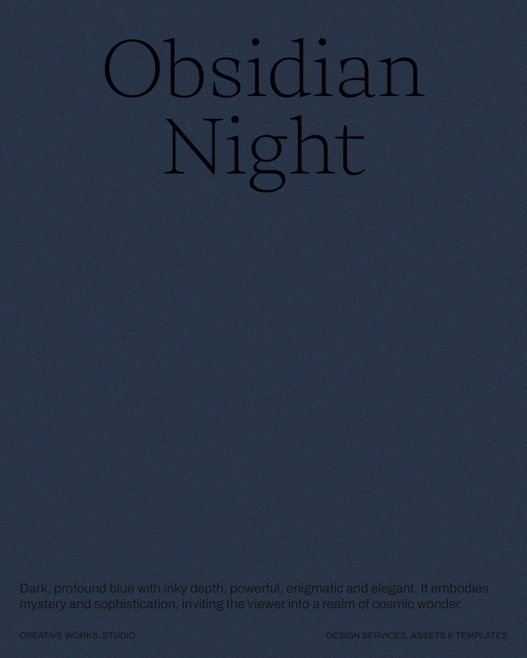 Dark, profound blue with inky depth, powerful, enigmatic and elegant. It embodies mystery and sophistication, inviting the viewer into a realm of cosmic wonder.