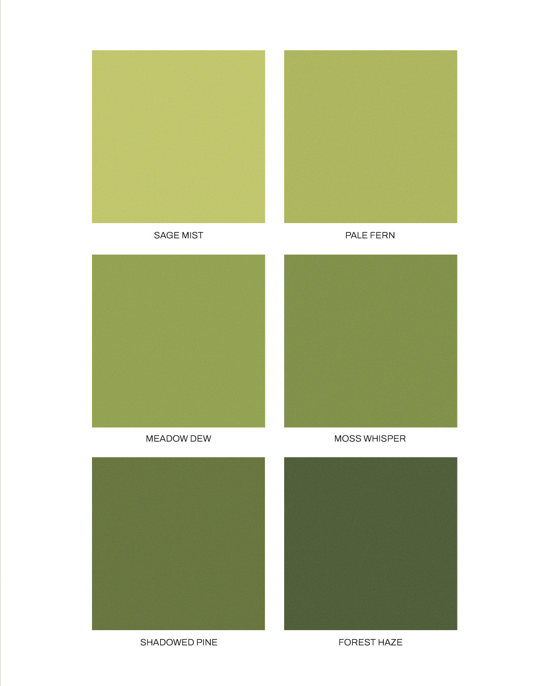 Fresh, grounded, and balanced. Calming green shades that embody natural harmony and understated elegance—vibrant yet soothing, full of life, depth, and tranquility.