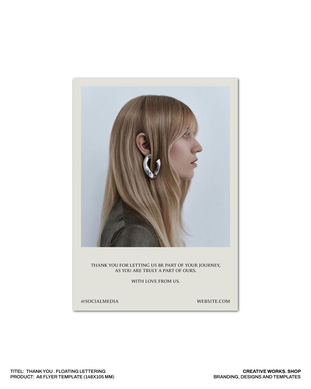 Add a touch of elegance and contemporary style with this airy, minimalist A6 “THANK YOU” flyer template. The floating lettering design creates a light and sophisticated visual effect, perfect for personal notes, greeting cards, webshops, and professional branding.